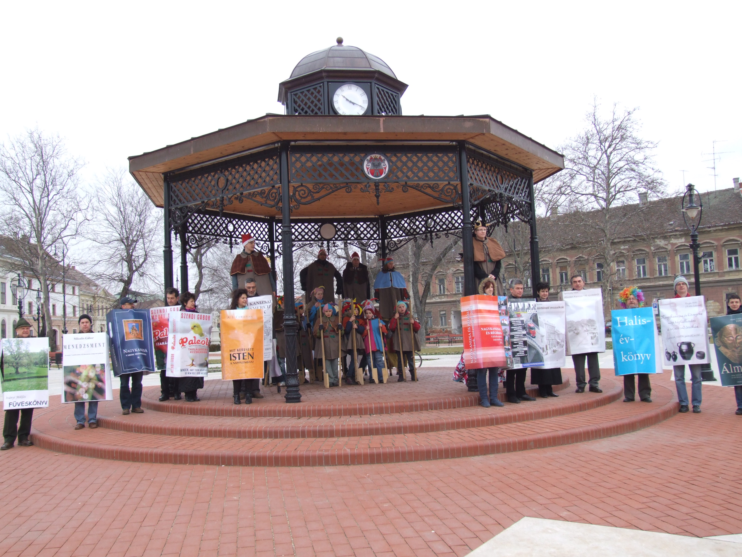 Nyilvános 959 | 1316 | 2013. február 9. A farsangi fánkfesztiválra készülve felhívásban kértük olvasóinkat, hogy öltsék magukra kedves könyvüket. Egy „könyvespolcnyi” jelentkező vette magára kedves olvasmányát, az ő vonulásukról készültek ezek a képek. A környezetükben néhol láthatók a Nagykanizsai Gólyalábasok, akik szintén a könyvtárhoz kötődnek. A „felvonuló kötetek” a könyvtár épületében még megtekinthetők. | |