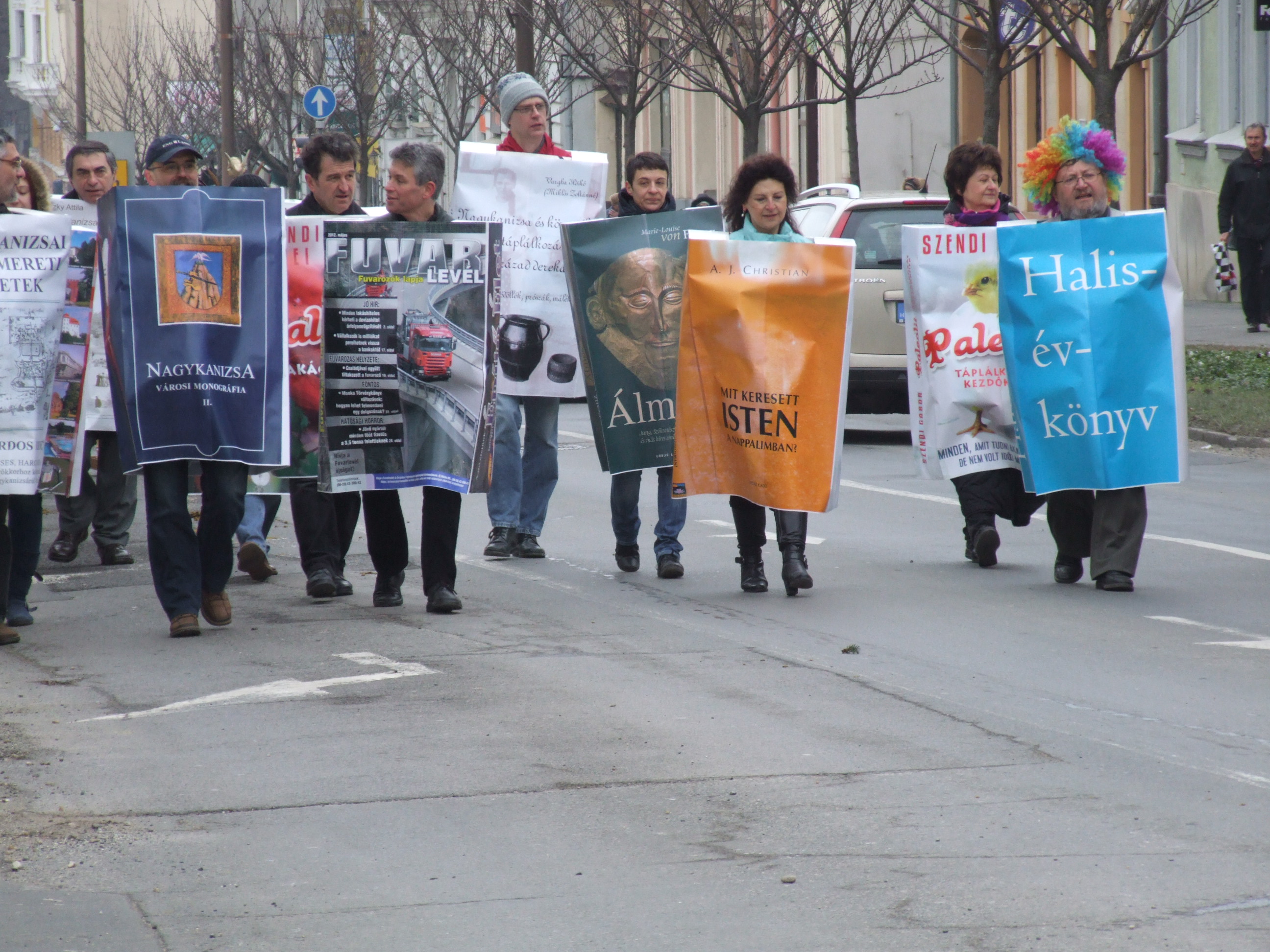 Nyilvános 941 | 1282 | 2013. február 9. A farsangi fánkfesztiválra készülve felhívásban kértük olvasóinkat, hogy öltsék magukra kedves könyvüket. Egy „könyvespolcnyi” jelentkező vette magára kedves olvasmányát, az ő vonulásukról készültek ezek a képek. A környezetükben néhol láthatók a Nagykanizsai Gólyalábasok, akik szintén a könyvtárhoz kötődnek. A „felvonuló kötetek” a könyvtár épületében még megtekinthetők. | |
