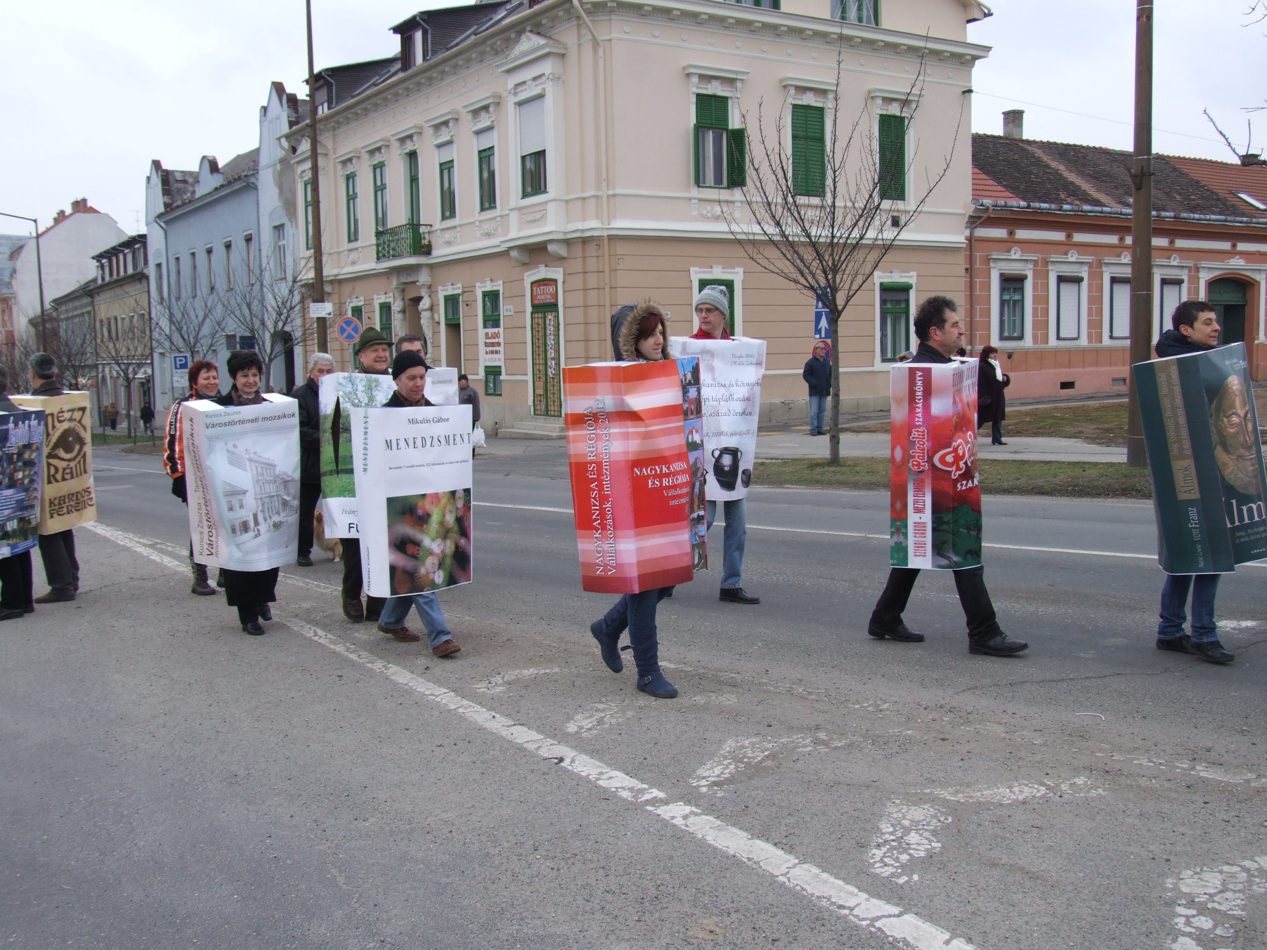 Nyilvános 954 | 1239 | 2013. február 9. A farsangi fánkfesztiválra készülve felhívásban kértük olvasóinkat, hogy öltsék magukra kedves könyvüket. Egy „könyvespolcnyi” jelentkező vette magára kedves olvasmányát, az ő vonulásukról készültek ezek a képek. A környezetükben néhol láthatók a Nagykanizsai Gólyalábasok, akik szintén a könyvtárhoz kötődnek. A „felvonuló kötetek” a könyvtár épületében még megtekinthetők. | |