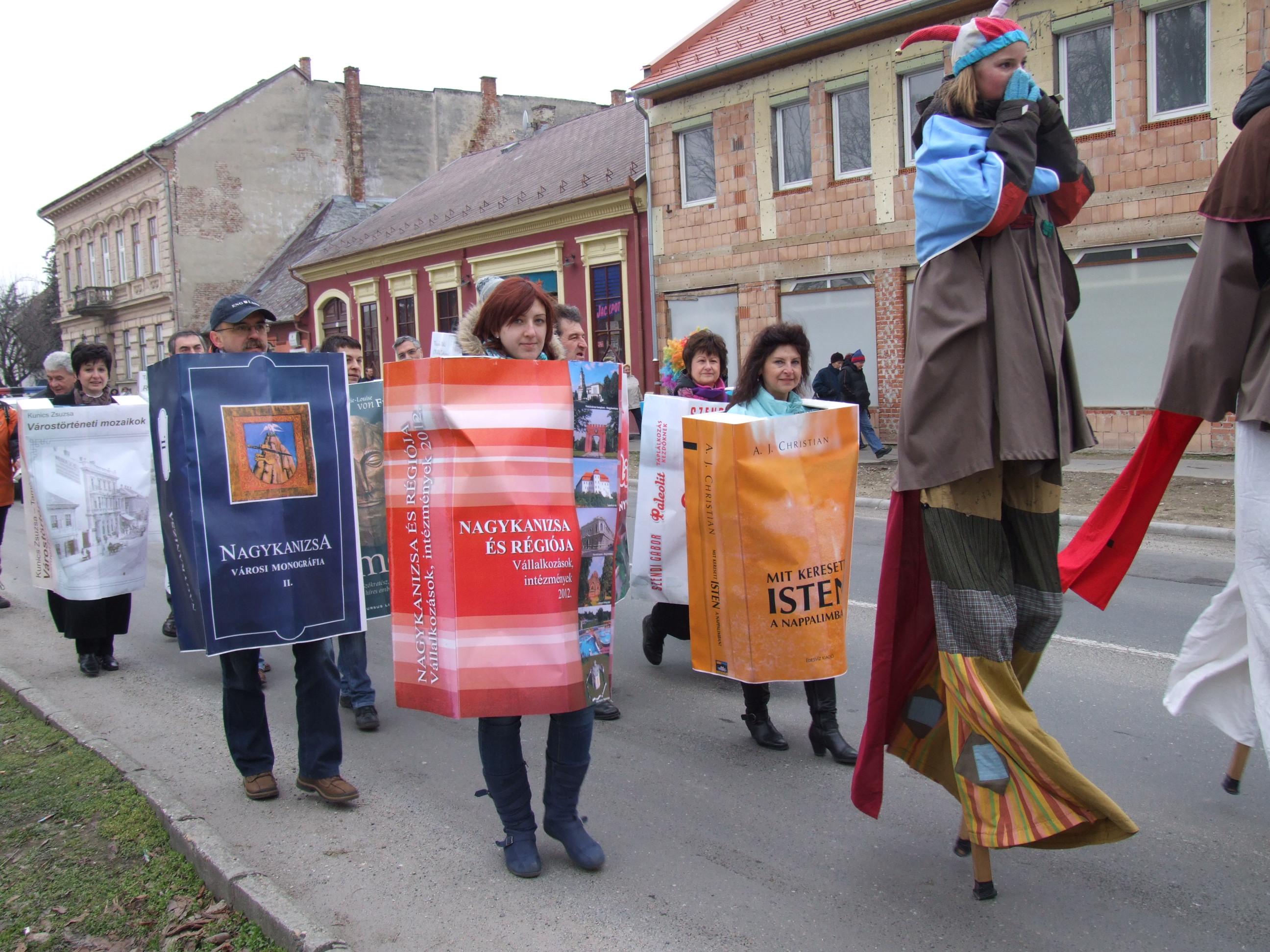 Nyilvános 909 | 1264 | 2013. február 9. A farsangi fánkfesztiválra készülve felhívásban kértük olvasóinkat, hogy öltsék magukra kedves könyvüket. Egy „könyvespolcnyi” jelentkező vette magára kedves olvasmányát, az ő vonulásukról készültek ezek a képek. A környezetükben néhol láthatók a Nagykanizsai Gólyalábasok, akik szintén a könyvtárhoz kötődnek. A „felvonuló kötetek” a könyvtár épületében még megtekinthetők. | |