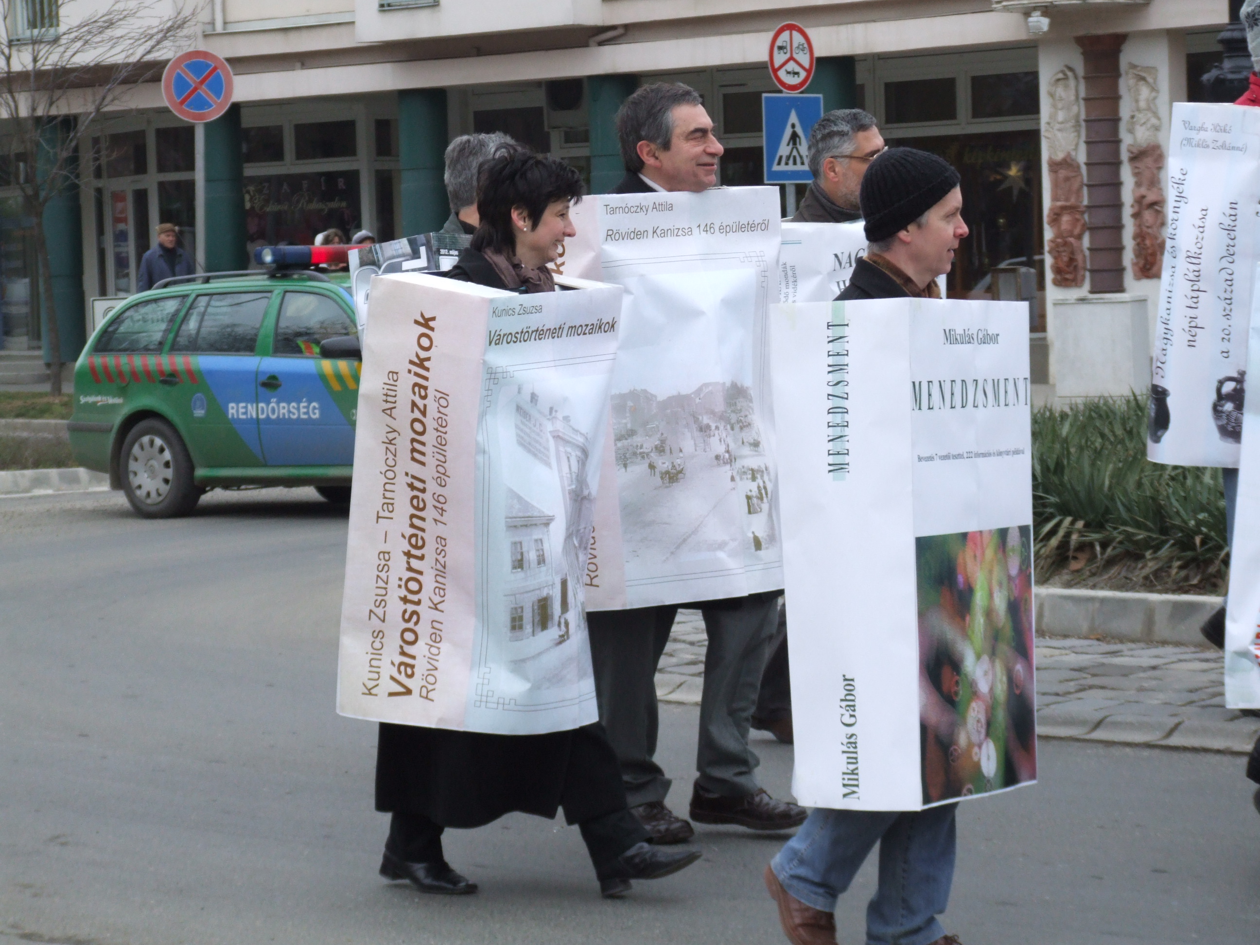 Nyilvános 943 | 1270 | 2013. február 9. A farsangi fánkfesztiválra készülve felhívásban kértük olvasóinkat, hogy öltsék magukra kedves könyvüket. Egy „könyvespolcnyi” jelentkező vette magára kedves olvasmányát, az ő vonulásukról készültek ezek a képek. A környezetükben néhol láthatók a Nagykanizsai Gólyalábasok, akik szintén a könyvtárhoz kötődnek. A „felvonuló kötetek” a könyvtár épületében még megtekinthetők. | |