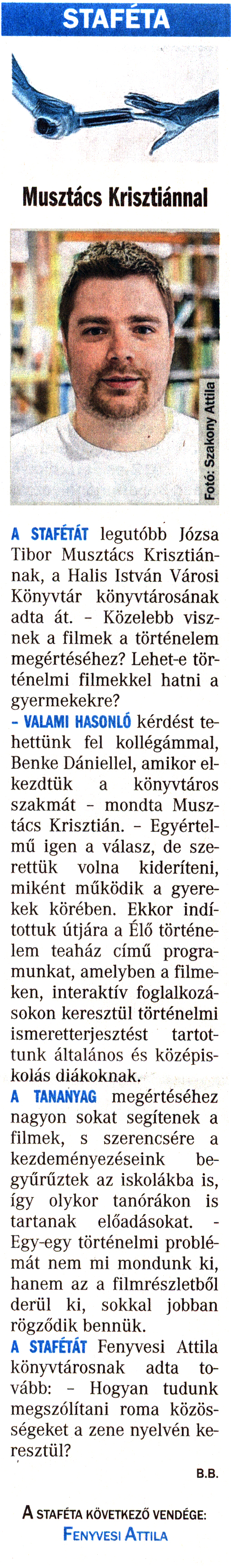 Nyilvános 1718 | 4358 | Vasárnapi Zalai Hírlap 2017. május 27. 21. szám 5. oldal | STAFÉTA Musztács Krisztiánnal A STAFÉTÁT legutóbb Józsa Tibor Musztács Krisztiánnak, a Halis István Városi Könyvtár könyvtárosának adta át. - Közelebb visznek a filmek a történelem megértéséhez? Lehet-e történelmi filmekkel hatni a gyermekekre? - VALAMI HASONLÓ kérdést tehettünk fel kollégámmal, Benke Dániellel, amikor elkezdtük a könyvtáros szakmát - mondta Musztács Krisztián. - Egyértelmű igen a válasz, de szerettük volna kideríteni, miként működik a gyerekek körében. Ekkor indítottuk útjára a Élő történelem teaház című programunkat, amelyben a filmeken, interaktív foglalkozásokon keresztül történelmi ismeretterjesztést tartottunk általános és középiskolás diákoknak. A TANANYAG megértéséhez nagyon sokat segítenek a filmek, s szerencsére a kezdeményezéseink begyűrűztek az iskolákba is, így olykor tanórákon is tartanak előadásokat. - Egy-egy történelmi problémát nem mi mondunk ki, hanem az a filmrészletből derül ki, sokkal jobban rögződik bennük. A STAFÉTÁT Fenyvesi Attila könyvtárosnak adta tovább: - Hogyan tudunk megszólítani roma közösségeket a zene nyelvén keresztül? B.B. A STAFÉTA KÖVETKEZŐ VENDÉGE: Fenyvesi Attila |