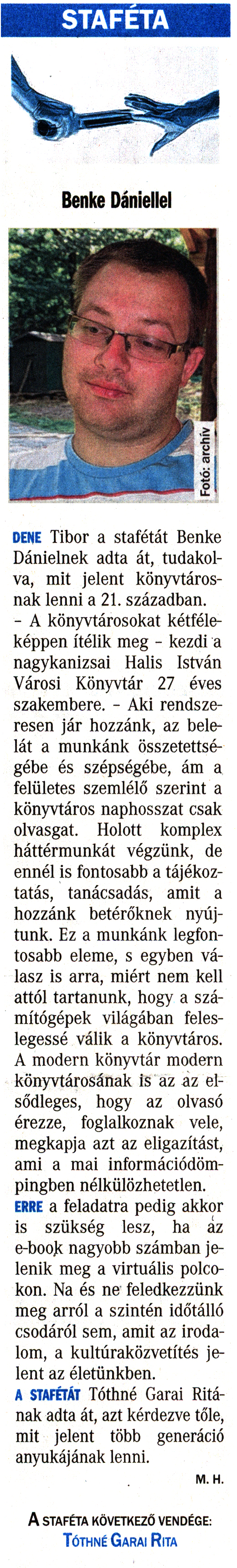Nyilvános 1740 | 4611 | Vasárnapi Zalai Hírlap 2016. június 5. 20. szám 5. oldal | STAFÉTA DENE Tibor a stafétát Benke Dánielnek adta át, tudakolva, mit jelent könyvtárosnak lenni a 21. században. - A könyvtárosokat kétféleképpen ítélik meg - kezdi a nagykanizsai Halis István Városi Könyvtár 27 éves szakembere. - Aki rendszeresen jár hozzánk, az belelát a munkánk összetettségébe és szépségébe, ám a felületes szemlélő szerint a könyvtáros naphosszat csak olvasgat. Holott komplex háttérmunkát végzünk, de ennél is fontosabb a tájékoztatás, tanácsadás, amit a hozzánk betérőknek nyújtunk. Ez a munkánk legfontosabb eleme, s egyben válasz is arra, miért nem kell attól tartanunk, hogy a számítógépek világában feleslegessé válik a könyvtáros. A modern könyvtár modern könyvtárosának is az az elsődleges, hogy az olvasó érezze, foglalkoznak vele, megkapja azt az eligazítást, ami a mai információdömpingben nélkülözhetetlen. ERRE a feladatra pedig akkor is szükség lesz, ha az e-book nagyobb számban jelenik meg a virtuális polcokon. Na és ne feledkezzünk meg arról a szintén időtálló csodáról sem, amit az irodalom, a kultúraközvetítés jelent az életünkben. A STAFÉTÁT Tóthné Garai Ritának adta át, azt kérdezve tőle, mit jelent több generáció anyukájának lenni. M. H. A staféta következő vendége: Tóthné Garai Rita |
