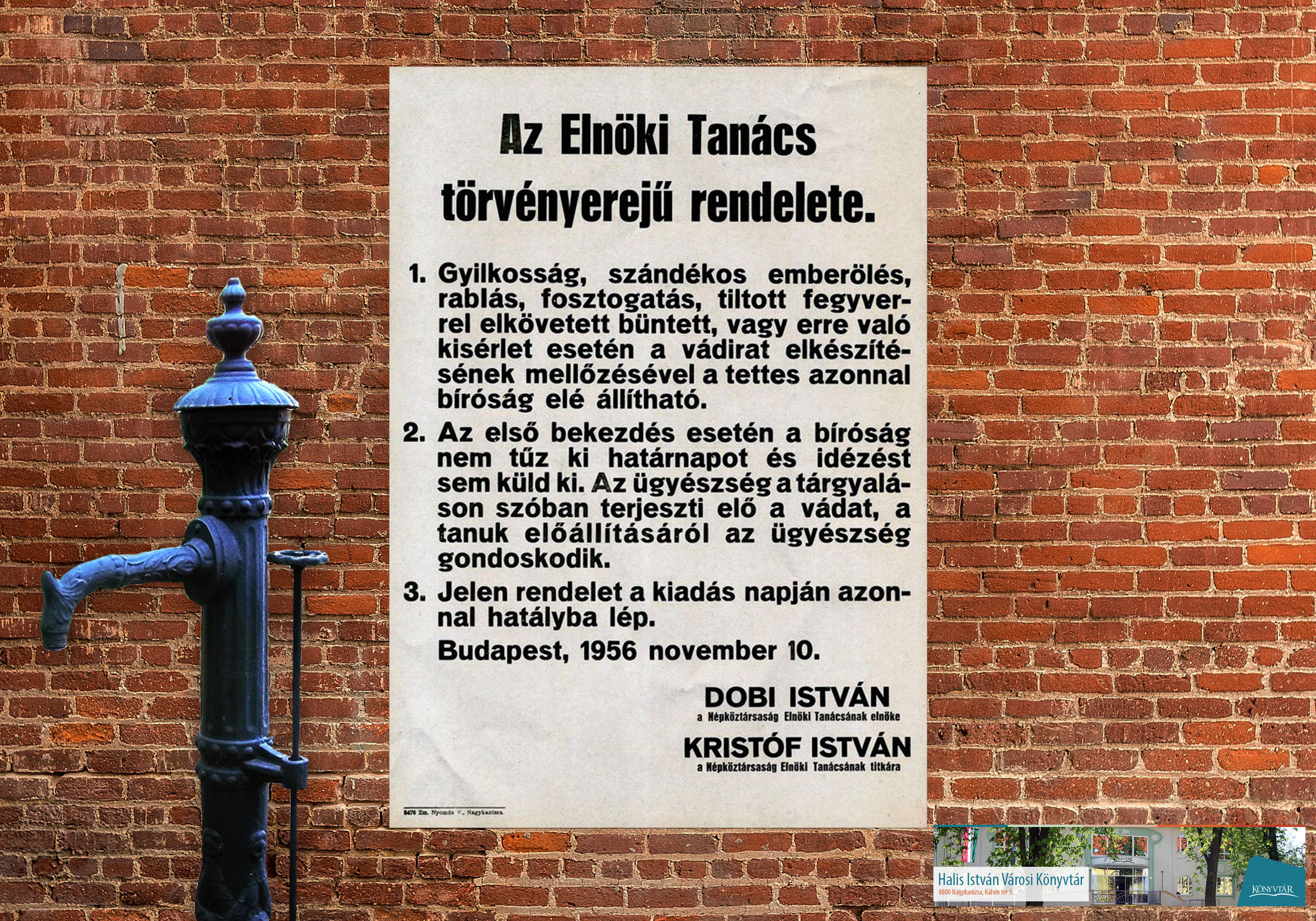 Nyilvános 1268 | 2183 | Az 1956-os forradalom leverése után | Október 23-i kiállításunk következő falragasza egy központi intézkedés helyben nyomtatott formáját mutatja be. Rendkívüli idők rendkívüli intézkedését olvashatták a kortársak az utcákon. Az olvashatóság érdekében kattintson a képre! |