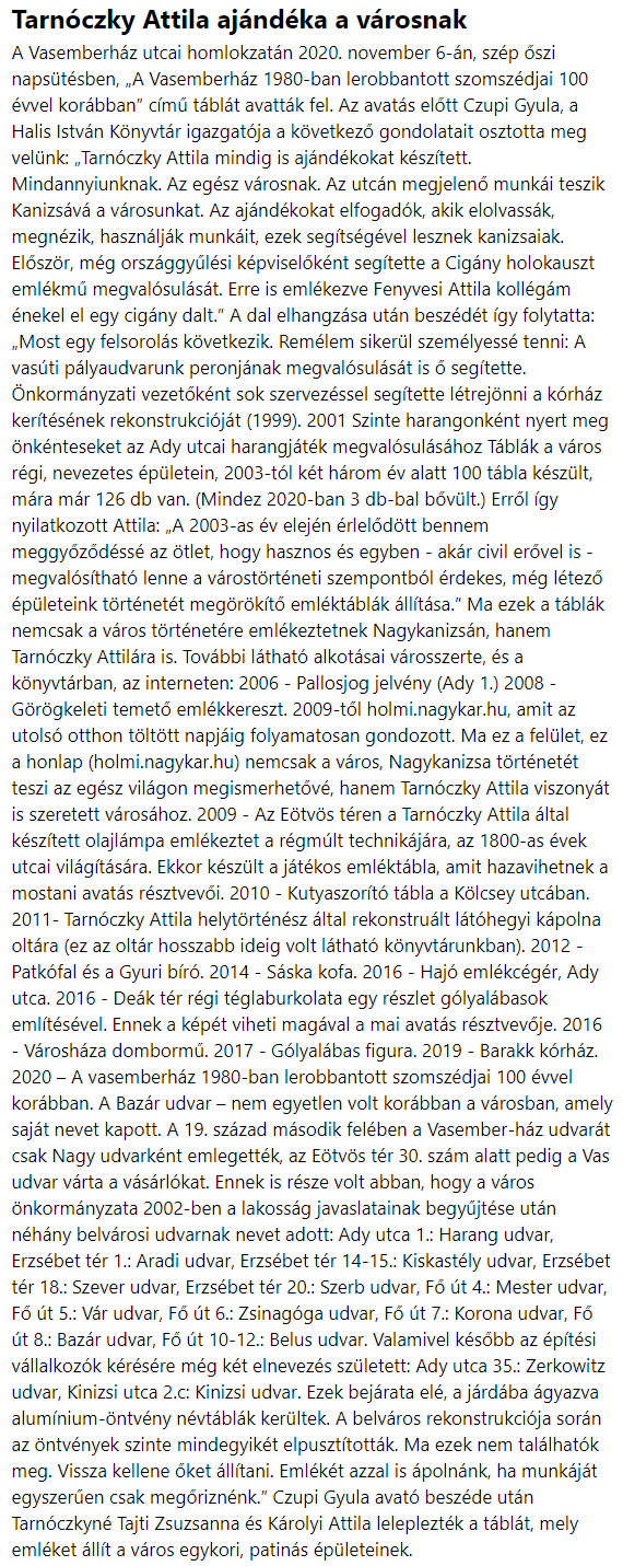 Nyilvános 1190 | 1840 | Tarnóczky Attila ajándéka a városnak | A Vasemberház utcai homlokzatán 2020. november 6-án, szép őszi napsütésben, „A Vasemberház 1980-ban lerobbantott szomszédjai 100 évvel korábban” című táblát avatták fel. Az avatás előtt Czupi Gyula, a Halis István Könyvtár igazgatója a következő gondolatait osztotta meg velünk: „Tarnóczky Attila mindig is ajándékokat készített. Mindannyiunknak. Az egész városnak. Az utcán megjelenő munkái teszik Kanizsává a városunkat. Az ajándékokat elfogadók, akik elolvassák, megnézik, használják munkáit, ezek segítségével lesznek kanizsaiak. Először, még országgyűlési képviselőként segítette a Cigány holokauszt emlékmű megvalósulását. Erre is emlékezve Fenyvesi Attila kollégám énekel el egy cigány dalt.” A dal elhangzása után beszédét így folytatta: „Most egy felsorolás következik. Remélem sikerül személyessé tenni: A vasúti pályaudvarunk peronjának megvalósulását is ő segítette. Önkormányzati vezetőként sok szervezéssel segítette létrejönni a kórház kerítésének rekonstrukcióját (1999). 2001 Szinte harangonként nyert meg önkénteseket az Ady utcai harangjáték megvalósulásához Táblák a város régi, nevezetes épületein, 2003-tól két három év alatt 100 tábla készült, mára már 126 db van. (Mindez 2020-ban 3 db-bal bővült.) Erről így nyilatkozott Attila: „A 2003-as év elején érlelődött bennem meggyőződéssé az ötlet, hogy hasznos és egyben - akár civil erővel is - megvalósítható lenne a várostörténeti szempontból érdekes, még létező épületeink történetét megörökítő emléktáblák állítása.” Ma ezek a táblák nemcsak a város történetére emlékeztetnek Nagykanizsán, hanem Tarnóczky Attilára is. További látható alkotásai városszerte, és a könyvtárban, az interneten: 2006 - Pallosjog jelvény (Ady 1.) 2008 - Görögkeleti temető emlékkereszt. 2009-től holmi.nagykar.hu, amit az utolsó otthon töltött napjáig folyamatosan gondozott. Ma ez a felület, ez a honlap (holmi.nagykar.hu) nemcsak a város, Nagykanizsa történetét teszi az egész világon megismerhetővé, hanem Tarnóczky Attila viszonyát is szeretett városához. 2009 - Az Eötvös téren a Tarnóczky Attila által készített olajlámpa emlékeztet a régmúlt technikájára, az 1800-as évek utcai világítására. Ekkor készült a játékos emléktábla, amit hazavihetnek a mostani avatás résztvevői. 2010 - Kutyaszorító tábla a Kölcsey utcában. 2011- Tarnóczky Attila helytörténész által rekonstruált látóhegyi kápolna oltára (ez az oltár hosszabb ideig volt látható könyvtárunkban). 2012 - Patkófal és a Gyuri bíró. 2014 - Sáska kofa. 2016 - Hajó emlékcégér, Ady utca. 2016 - Deák tér régi téglaburkolata egy részlet gólyalábasok említésével. Ennek a képét viheti magával a mai avatás résztvevője. 2016 - Városháza dombormű. 2017 - Gólyalábas figura. 2019 - Barakk kórház. 2020 – A vasemberház 1980-ban lerobbantott szomszédjai 100 évvel korábban. A Bazár udvar – nem egyetlen volt korábban a városban, amely saját nevet kapott. A 19. század második felében a Vasember-ház udvarát csak Nagy udvarként emlegették, az Eötvös tér 30. szám alatt pedig a Vas udvar várta a vásárlókat. Ennek is része volt abban, hogy a város önkormányzata 2002-ben a lakosság javaslatainak begyűjtése után néhány belvárosi udvarnak nevet adott: Ady utca 1.: Harang udvar, Erzsébet tér 1.: Aradi udvar, Erzsébet tér 14-15.: Kiskastély udvar, Erzsébet tér 18.: Szever udvar, Erzsébet tér 20.: Szerb udvar, Fő út 4.: Mester udvar, Fő út 5.: Vár udvar, Fő út 6.: Zsinagóga udvar, Fő út 7.: Korona udvar, Fő út 8.: Bazár udvar, Fő út 10-12.: Belus udvar. Valamivel később az építési vállalkozók kérésére még két elnevezés született: Ady utca 35.: Zerkowitz udvar, Kinizsi utca 2.c: Kinizsi udvar. Ezek bejárata elé, a járdába ágyazva alumínium-öntvény névtáblák kerültek. A belváros rekonstrukciója során az öntvények szinte mindegyikét elpusztították. Ma ezek nem találhatók meg. Vissza kellene őket állítani. Emlékét azzal is ápolnánk, ha munkáját egyszerűen csak megőriznénk.” Czupi Gyula avató beszéde után Tarnóczkyné Tajti Zsuzsanna és Károlyi Attila leleplezték a táblát, mely emléket állít a város egykori, patinás épületeinek. |