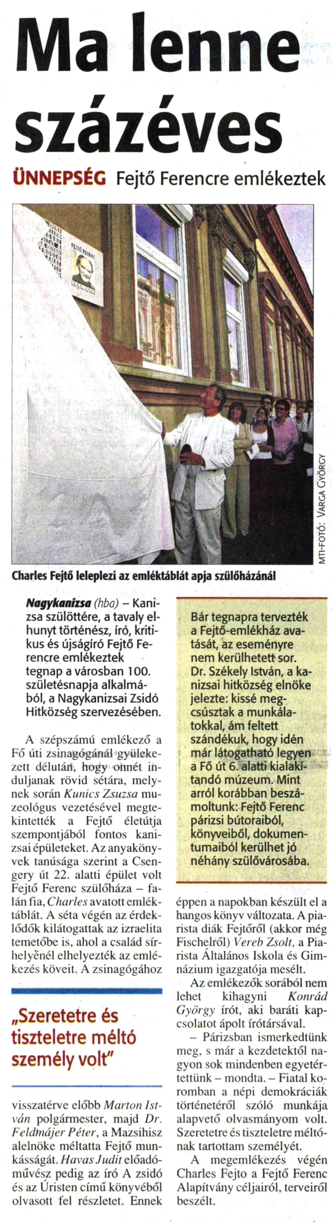 Nyilvános 974 | 1310 | Zalai Hírlap 2009. augusztus 31. 5. oldal | Ma lenne százéves ÜNNEPSÉG Fejtő Ferencre emlékeztek Bár tegnapra tervezték a Fejtő-emlékház avatását, az eseményre nem kerülhetett sor. Dr. Székely István, a kanizsai hitközség elnöke jelezte: kissé megcsúsztak a munkálatokkal, ám feltett szándékuk, hogy idén már látogatható legyen a Fő út 6. alatti kialakítandó múzeum. Mint arról korábban beszámoltunk: Fejtő Ferenc párizsi bútoraiból, könyveiből, dokumentumaiból kerülhet jó néhány szülővárosába. Nagykanizsa (hba) - Kanizsa szülöttére, a tavaly elhunyt történész, író, kritikus és újságíró Fejtő Ferencre emlékeztek tegnap a városban 100. születésnapja alkalmából, a Nagykanizsai Zsidó Hitközség szervezésében. A szépszámú emlékező a Fő úti zsinagógánál gyülekezett délutárí, hogy onnét induljanak rövid sétára, melynek során Kunics Zsuzsa muzeológus vezetésével megtekintették a Fejtő életútja szempontjából fontos kanizsai épületeket. Az anyakönyvek tanúsága szerint a Csen- gery út 22. alatti épület volt Fejtő Ferenc szülőháza - falán fia, Charles avatott emléktáblát. A séta végén az érdeklődők kilátogattak az izraelita temetőbe is, ahol a család sírhelyénél elhelyezték az emlékezés köveit. A zsinagógához visszatérve előbb Marton István polgármester, majd Dr. Feldtnájer Péter, a Mazsihisz alelnöke méltatta Fejtő munkásságát. Havas Judité lőadó- művész pedig az író A zsidó és az Úristen című könyvéből olvasott fel részletet. Ennek éppen a napokban készült el a hangos könyv változata. A piarista diák Fejtőről (akkor még Fischelről) Vereb Zsolt, a Piarista Általános Iskola és Gimnázium igazgatója mesélt. Az emlékezők sorából nem lehet kihagyni Konrád György írót, aki baráti kapcsolatot ápolt írótársával. - Párizsban ismerkedtünk meg, s már a kezdetektől nagyon sok mindenben egyetértettünk- mondta. - Fiatal koromban a népi demokráciák történetéről szóló munkája alapvető olvasmányom volt. Szeretetre és tiszteletre méltónak tartottam személyét. A megemlékezés végén Charles Fejtő a Fejtő Ferenc Alapítvány céljairól, terveiről beszélt. Charles Fejtő leleplezi az emléktáblát apja szülőházánál |