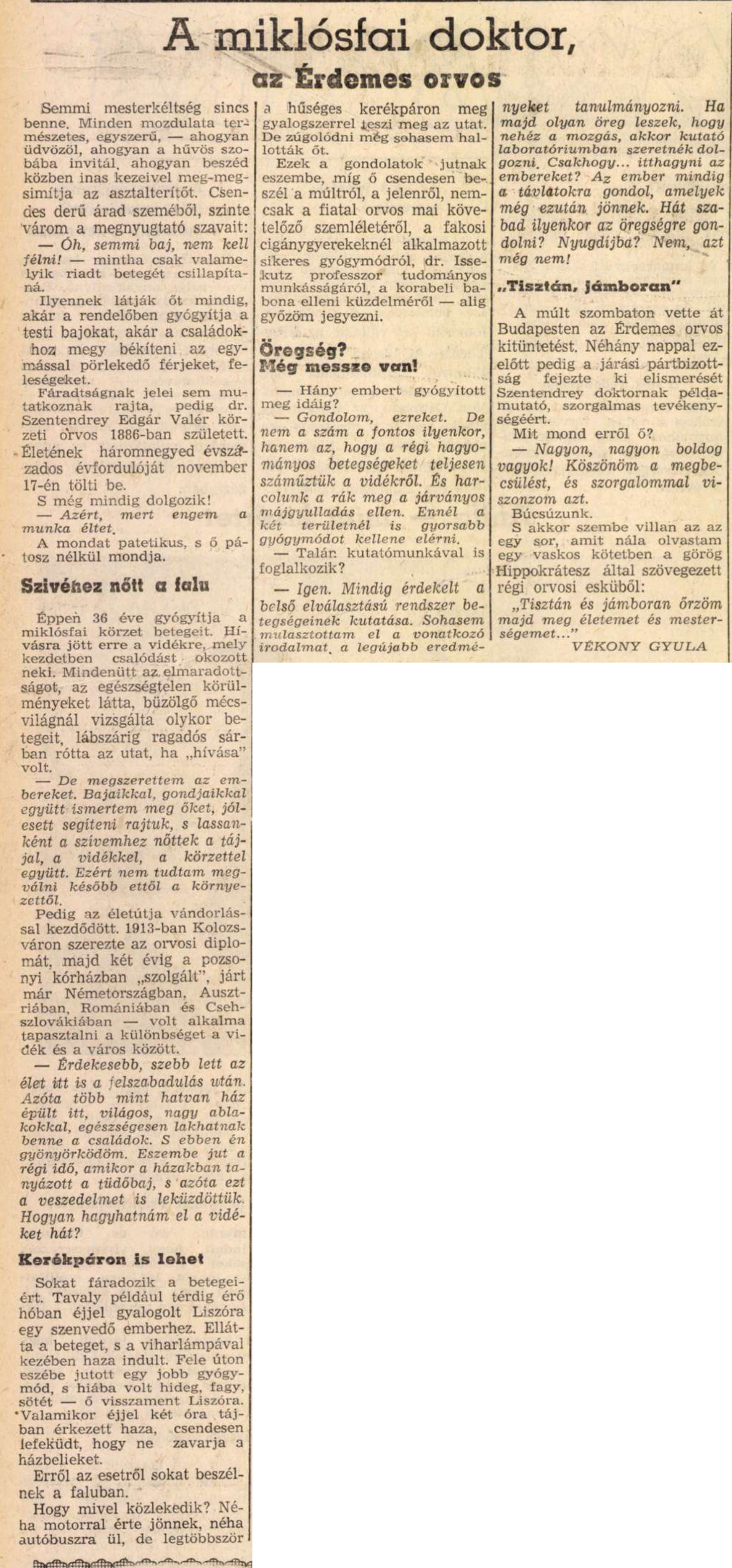 Nyilvános 1185 | 1874 | Zalai Hírlap 1961. július 9. 8. oldal | A miklósfai doktor, az Érdemes orvos Semmi mesterkéltség sincs benne. Minden mozdulata természetes, egyszerű, — ahogyan üdvözöl, ahogyan a hűvös szobába invitál, ahogyan beszéd közben inas kezeivel meg-megsimítja az asztalterítőt. Csendes derű árad szeméből, szinte várom a megnyugtató szavait: — Óh, semmi baj, nem kell félni! — mintha csak valamelyik riadt betegét csillapítaná. Ilyennek látják őt mindig, akár a rendelőben gyógyítja a testi bajokat, akár a családokhoz megy békíteni az egymással pörlekedő férjeket, feleségeket. Fáradtságnak jelei sem mutatkoznak rajta, pedig dr. Szentendrey Edgár Valér körzeti orvos 1886-ban született. Életének háromnegyed évszázados évfordulóját november 17-én tölti be. S még mindig dolgozik! — Azért, mert engem a munka éltet. A mondat patetikus, s ő pátosz nélkül mondja. Szívéhez nőtt a falu Éppen 36 éve gyógyítja a miklósfai körzet betegeit. Hívásra jött erre a vidékre, mely kezdetben csalódást okozott neki. Mindenütt az elmaradottságot, az egészségtelen körülményeket látta, büzölgő mécsvilágnál vizsgálta olykor betegeit, lábszárig ragadós sárban rótta az utat, ha „hívása” volt. — De megszerettem az embereket. Bajaikkal, gondjaikkal együtt ismertem meg őket, jólesett segíteni rajtuk, s lassanként a szívemhez nőttek a tájjal, a vidékkel, a körzettel együtt. Ezért nem tudtam megválni később ettől a környezettől. Pedig az életútja vándorlással kezdődött. 1913-ban Kolozsváron szerezte az orvosi diplomát, majd két évig a pozsonyi kórházban „szolgált”, járt már Németországban, Ausztriában, Romániában és Csehszlovákiában — volt alkalma tapasztalni a különbséget a vidék és a város között. — Érdekesebb, szebb lett az élért itt is a felszabadulás után. Azóta több mint hatvan ház épült itt, világos, nagy ablakokkal, egészségesen lakhatnak benne a családok. S ebben én gyönyörködöm. Eszembe jut a régi idő, amikor a házakban tanyázott a tüdőbaj, s azóta ezt a veszedelmet is leküzdöttük. Hogyan hagyhatnám el a vidéket hát? Kerékpáron is lehet Sokat fáradozik a betegeiért. Tavaly például térdig érő hóban éjjel gyalogolt Liszóra egy szenvedő emberhez. Ellátta a beteget, s a viharlámpával kezében haza indult. Fele úton eszébe jutott egy jobb gyógymód, s hiába volt hideg, fagy, sötét — ő visszament Liszóra. "Valamikor éjjel két óra tájban érkezett haza, csendesen lefeküdt, hogy ne zavarja a házbelieket. Erről az esetről sokat beszélnek a faluban. Hogy mivel közlekedik? Néha motorral érte jönnek, néha autóbuszra ül, de legtöbbször a hűséges kerékpáron meg gyalogszerrel teszi meg az utat. De zúgolódni még sohasem hallották őt. Ezek a gondolatok jutnak eszembe, míg ő csendesen beszél a múltról, a jelenről, nemcsak a fiatal orvos mai követelőző szemléletéről, a fakosi cigánygyerekeknél alkalmazott sikeres gyógymódról, dr. Issekutz professzor tudományos munkásságáról, a korabeli babona elleni küzdelméről — alig győzöm jegyezni. Öregség? Még messze van! — Hány embert gyógyított meg idáig? — Gondolom, ezreket. De nem a szám a fontos ilyenkor, hanem az, hogy a régi hagyományos betegségeket teljesen száműztük a vidékről. És harcolunk a rák meg a járványos májgyulladás ellen. Ennél a két területnél is gyorsabb gyógymódot kellene elérni. — Talán kutatómunkával is foglalkozik? — Igen. Mindig érdekelt a belső elválasztású rendszer betegségeinek kutatása. Sohasem mulasztottam el a vonatkozó irodalmat, a legújabb eredményeket tanulmányozni. Ha majd olyan öreg leszek, hogy nehéz a mozgás, akkor kutató laboratóriumban szeretnék dolgozni. Csakhogy... itthagyni az embereket? Az ember mindig a távlatokra gondol, amelyek még ezután jönnek. Hát szabad ilyenkor az öregségre gondolni? Nyugdíjba? Nem, azt még nem! „Tisztán, jámboran" A múlt szombaton vette át Budapesten az Érdemes orvos kitüntetést. Néhány nappal ezelőtt pedig a járási, pártbizottság fejezte ki elismerését Szentendrey doktornak példamutató, szorgalmas tevékenységéért. Mit mond erről ő? — Nagyon, nagyon boldog vagyok! Köszönöm a megbecsülést, és szorgalommal viszonzom azt. Búcsúzunk. S akkor szembe villan az az egy sor, amit nála olvastam egy vaskos kötetben a görög Hippokrátesz által szövegezett régi orvosi esküből: „Tisztán és jámboran őrzöm majd meg életemet és mesterségemet...” VÉKONY GYULA |