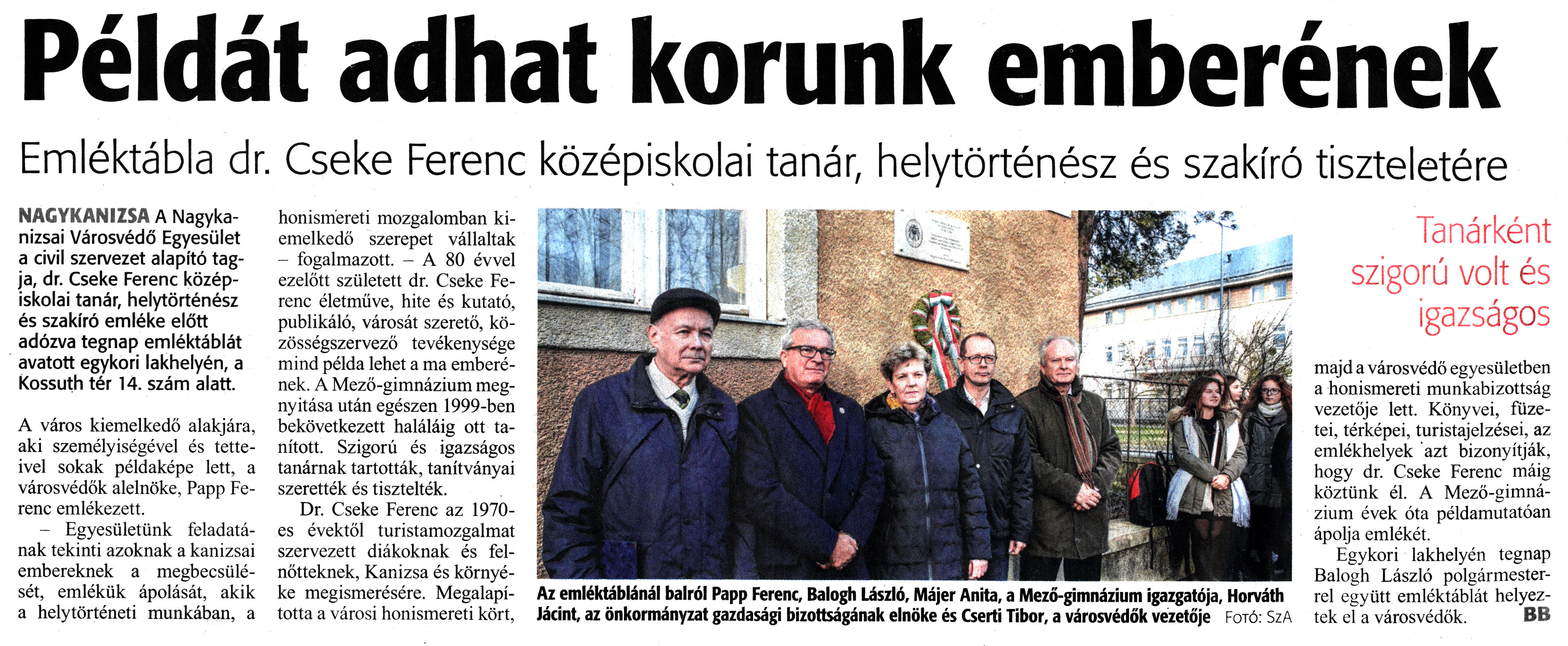 Nyilvános 972 | 1341 | Zalai Hírlap 2019. december 18. 293. szám 4. oldal | Példát adhat korunk emberének Emléktábla dr. Cseke Ferenc középiskolai tanár, helytörténész és szakíró tiszteletére NAGYKANIZSA A Nagykanizsai Városvédő Egyesület a civil szervezet alapító tagja, dr. Cseke Ferenc középiskolai tanár, helytörténész és szakíró emléke előtt adózva tegnap emléktáblát avatott egykori lakhelyén, a Kossuth tér 14. szám alatt. A város kiemelkedő alakjára, aki személyiségével és tetteivel sokak példaképe lett, a városvédők alelnöke, Papp Ferenc emlékezett. - Egyesületünk feladatának tekinti azoknak a kanizsai embereknek a megbecsülését, emlékük ápolását, akik a helytörténeti munkában, a honismereti mozgalomban kiemelkedő szerepet vállaltak - fogalmazott. - A 80 évvel ezelőtt született dr. Cseke Ferenc életműve, hite és kutató, publikáló, városát szerető, közösségszervező tevékenysége mind példa lehet a ma emberének. A Mező-gimnázium megnyitása után egészen 1999-ben bekövetkezett haláláig ott tanított. Szigorú és igazságos tanárnak tartották, tanítványai szerették és tisztelték. Dr. Cseke Ferenc az 1970-es évektől turistamozgalmat szervezett diákoknak és felnőtteknek, Kanizsa és környéke megismerésére. Megalapította a városi honismereti kört, majd a városvédő egyesületben a honismereti munkabizottság vezetője lett. Könyvei, füzetei, térképei, turistajelzései, az emlékhelyek azt bizonyítják, hogy dr. Cseke Ferenc máig köztünk él. A Mező-gimnázium évek óta példamutatóan ápolja emlékét. Egykori lakhelyén tegnap Balogh László polgármesterrel együtt emléktáblát helyeztek el a városvédők. BB Az emléktáblánál balról Papp Ferenc, Balogh László, Májer Anita, a Mező-gimnázium igazgatója, Horváth Jácint, az önkormányzat gazdasági bizottságának elnöke és Cserti Tibor, a városvédők vezetője Fotó: SzA |
