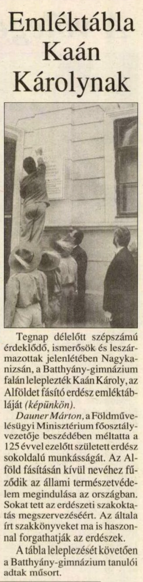 Nyilvános 1107 | 1727 | Zalai Hírlap 1992. május 23. 16. oldal | Emléktábla Kaán Károlynak Tegnap délelőtt szépszámú érdeklődő, ismerősök és leszármazottak jelenlétében Nagykanizsán, a Batthyány-gimnázium falán leleplezték Kaán Károly, az Alföldet fásító erdész emléktábláját (képünkön). Dauner Márton, a Földművelésügyi Minisztérium főosztályvezetője beszédében méltatta a 125 évvel ezelőtt született erdész sokoldalú munkásságát. Az Alföld fásításán kívül nevéhez fűződik az állami természetvédelem megindulása az országban. Sokat tett az erdészeti szakoktatás megszervezéséért. Az általa írt szakkönyveket ma is haszonnal forgathatják az erdészek. A tábla leleplezését követően a Batthyány-gimnázium tanulói adtak műsort. |