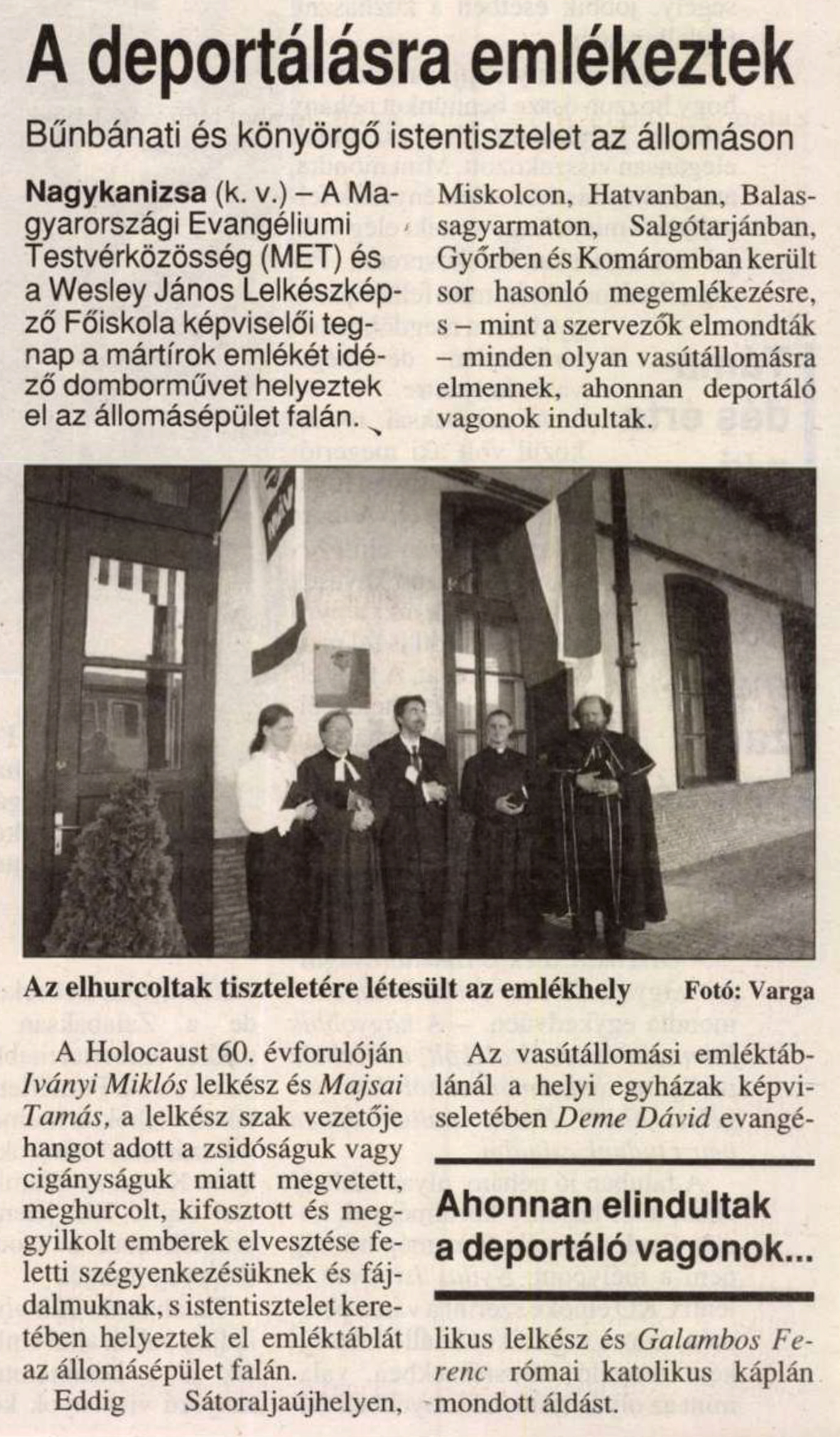 Nyilvános 926 | 1303 | Zalai Hírlap 2004. június 19. 5. oldal | A deportálásra emlékeztek Bűnbánati és könyörgő istentisztelet az állomáson Nagykanizsa (k. v.) - A Magyarországi Evangéliumi Testvérközösség (MET) és a Wesley János Lelkészképző Főiskola képviselői tegnap a mártírok emlékét idéző domborművet helyeztek el az állomásépület falán. A Holocaust 60. évforulóján Iványi Miklós lelkész és Majsai Tamás, a lelkész szak vezetője hangot adott a zsidóságuk vagy cigányságuk miatt megvetett, meghurcolt, kifosztott és meggyilkolt emberek elvesztése feletti szégyenkezésüknek és fájdalmuknak, s istentisztelet keretében helyeztek el emléktáblát az állomásépület falán. Eddig Sátoraljaújhelyen, Miskolcon, Hatvanban, Balassagyarmaton, Salgótarjánban, Győrben és Komáromban került sor hasonló megemlékezésre, s - mint a szervezők elmondták - minden olyan vasútállomásra elmennek, ahonnan deportáló vagonok indultak. Az vasútállomási emléktáblánál a helyi egyházak képviseletében Deme Dávid evangélikus lelkész és Galambos Ferenc római katolikus káplán mondott áldást. Az elhurcoltak tiszteletére létesült az emlékhely Fotó: Varga |