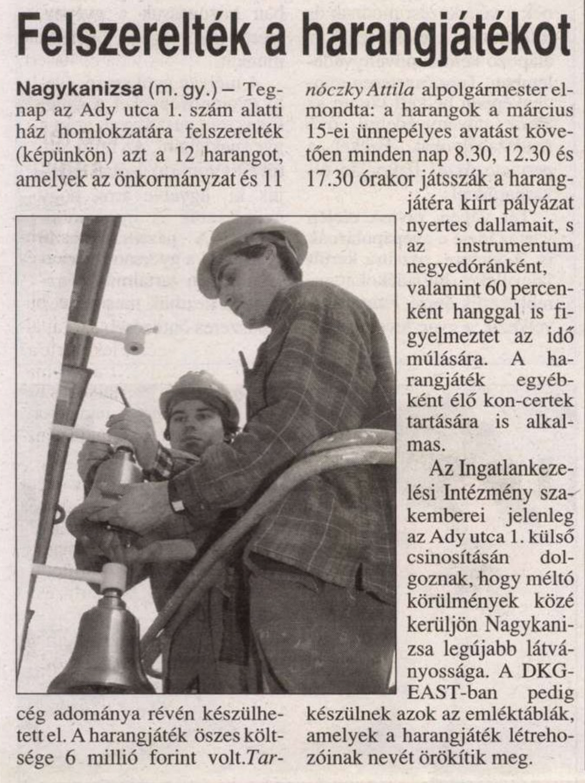 Nyilvános 1031 | 1547 | Zalai Hírlap 2001. március 6. 5. oldal | Felszerelték a harangjátékot Nagykanizsa (m. gy.) — Tegnap az Ady utca 1. szám alatti ház homlokzatára felszerelték (képünkön) azt a 12 harangot, amelyek az önkormányzat és 11 cég adománya révén készülhetett el. A harangjáték öszes költsége 6 millió forint volt. Tarnóczky Attila alpolgármester elmondta: a harangok a március 15-ei ünnepélyes avatást követően minden nap 8.30, 12.30 és 17.30 órakor játsszák a harangjátéra kiírt pályázat nyertes dallamait, s az instrumentum negyedóránként, valamint 60 percenként hanggal is figyelmeztet az idő múlására. A harangjáték egyébként élő koncertek tartására is alkalmas. Az Ingatlankezelési Intézmény szakemberei jelenleg az Ady utca 1. külső csinosításán dolgoznak, hogy méltó körülmények közé kerüljön Nagykanizsa legújabb látványossága. A DKG- EAST-ban pedig készülnek azok az emléktáblák, amelyek a harangjáték létrehozóinak nevét örökítik meg. |