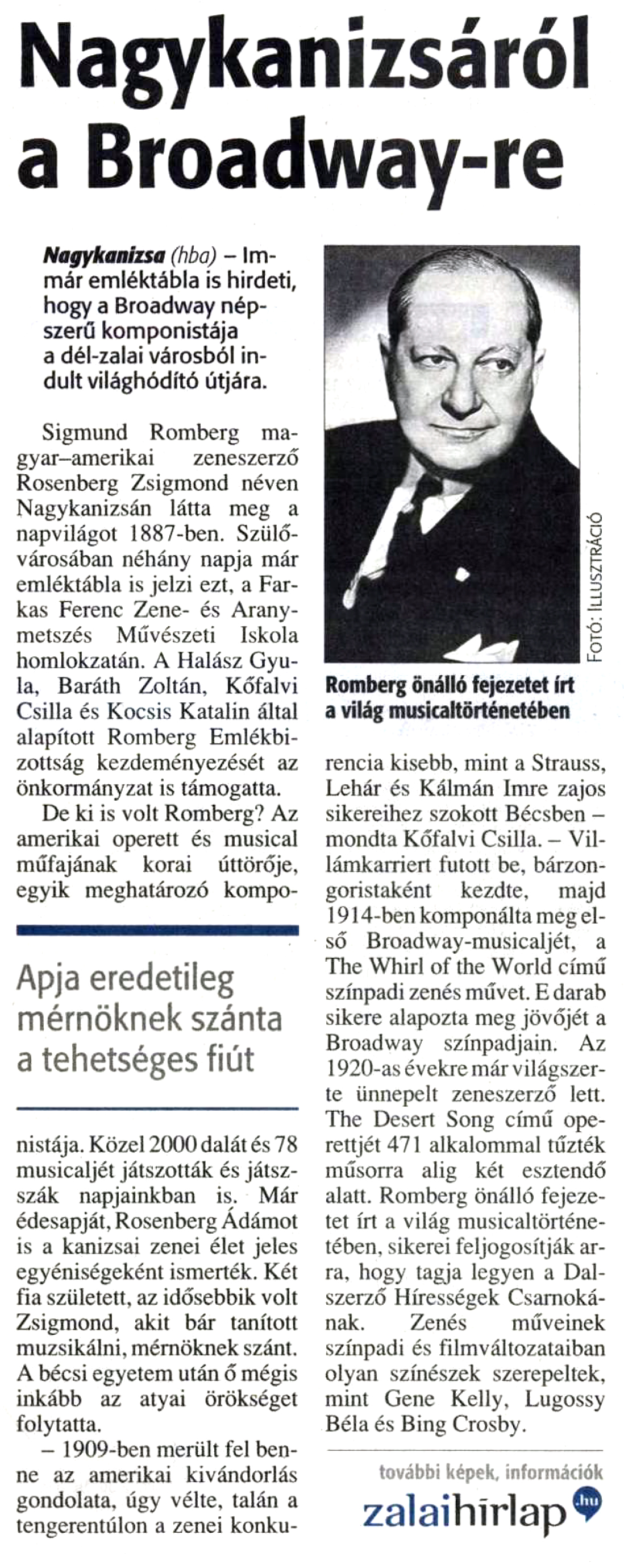 Nyilvános 828 | 972 | Zalai Hírlap 2010. október 1. 7. oldal | Nagykanizsáról a Broadway-re Nagykanizsa (hba) - Immár emléktábla is hirdeti, hogy a Broadway népszerű komponistája a dél-zalai városból indult világhódító útjára. Sigmund Romberg magyar-amerikai zeneszerző Rosenberg Zsigmond néven Nagykanizsán látta meg a napvilágot 1887-ben. Szülővárosában néhány napja már emléktábla is jelzi ezt, a Farkas Ferenc Zene- és Aranymetszés Művészeti Iskola homlokzatán. A Halász Gyula, Baráth Zoltán, Kőfalvi Csilla és Kocsis Katalin által alapított Romberg Emlékbizottság kezdeményezését az önkormányzat is támogatta. De ki is volt Romberg? Az amerikai operett és musical műfajának korai úttörője, egyik meghatározó komponistája. Közel 2000 dalát és 78 musicaljét játszották és játsszák napjainkban is. Már édesapját, Rosenberg Ádámot is a kanizsai zenei élet jeles egyéniségeként ismerték. Két fia született, az idősebbik volt Zsigmond, akit bár tanított muzsikálni, mérnöknek szánt. A bécsi egyetem után ő mégis inkább az atyai örökséget folytatta. - 1909-ben merült fel benne az amerikai kivándorlás gondolata, úgy vélte, talán a tengerentúlon a zenei konkurencia kisebb, mint a Strauss, Lehár és Kálmán Imre zajos sikereihez szokott Bécsben - mondta Kőfalvi Csilla. - Villámkarriert futott be, bárzongoristaként kezdte, majd 1914-ben komponálta meg első Broadway-musicaljét, a The Whirl of the World című színpadi zenés művet. E darab sikere alapozta meg jövőjét a Broadway színpadjain. Az 1920-as évekre már világszerte ünnepelt zeneszerző lett. The Desert Song című operettjét 471 alkalommal tűzték műsorra alig két esztendő alatt. Romberg önálló fejezetet írt a világ musicaltörténetében, sikerei feljogosítják arra, hogy tagja legyen a Dalszerző Hírességek Csarnokának. Zenés műveinek színpadi és filmváltozataiban olyan színészek szerepeltek, mint Gene Kelly, Lugossy Béla és Bing Crosby. Romberg önálló fejezetet írt a világ musicaltörténetében |
